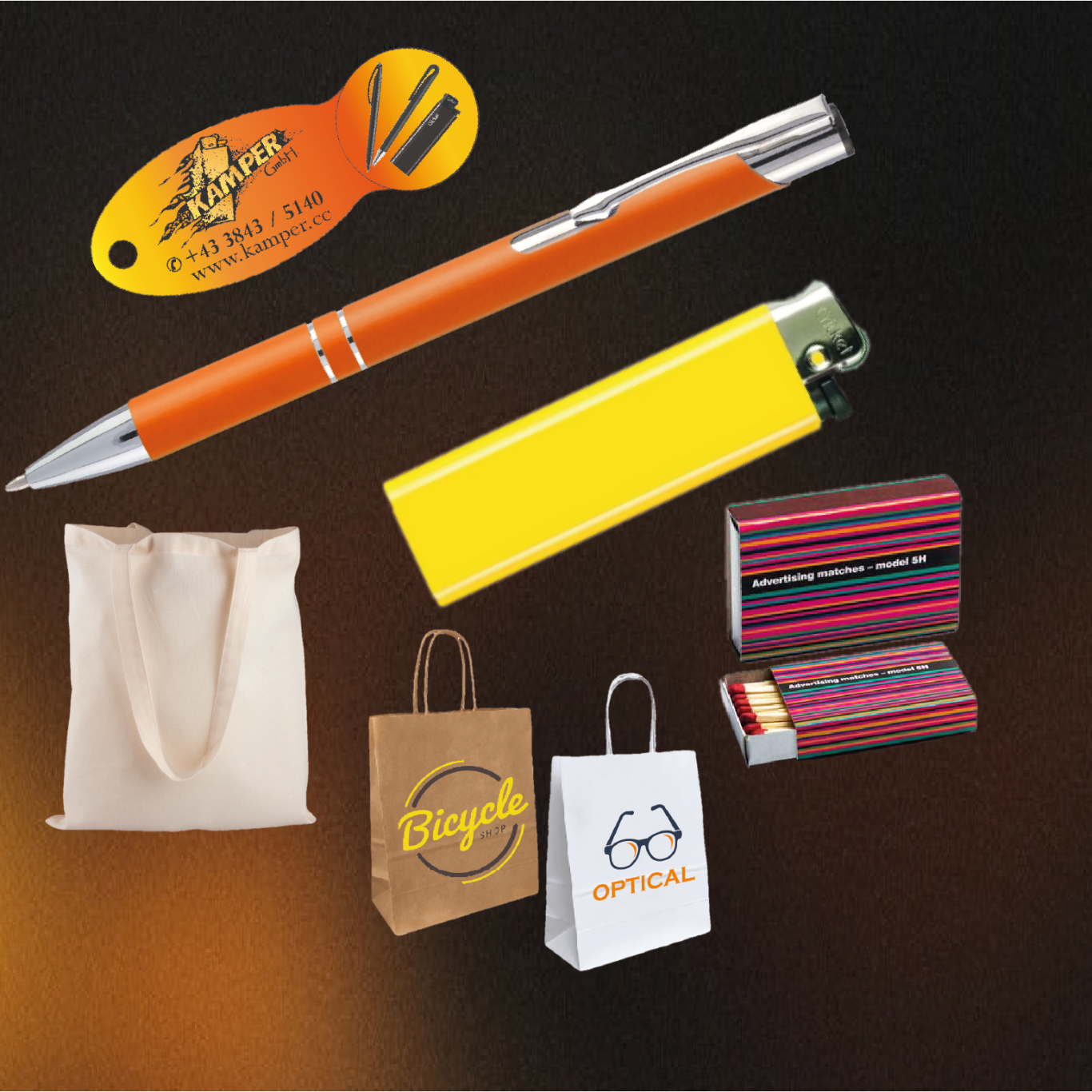 Entdecken Sie unser Sortiment an hochwertigen Werbeartikeln, die mit Ihrem Logo bedruckt und individuell gestaltet werden – perfekt für Ihr Geschäft.